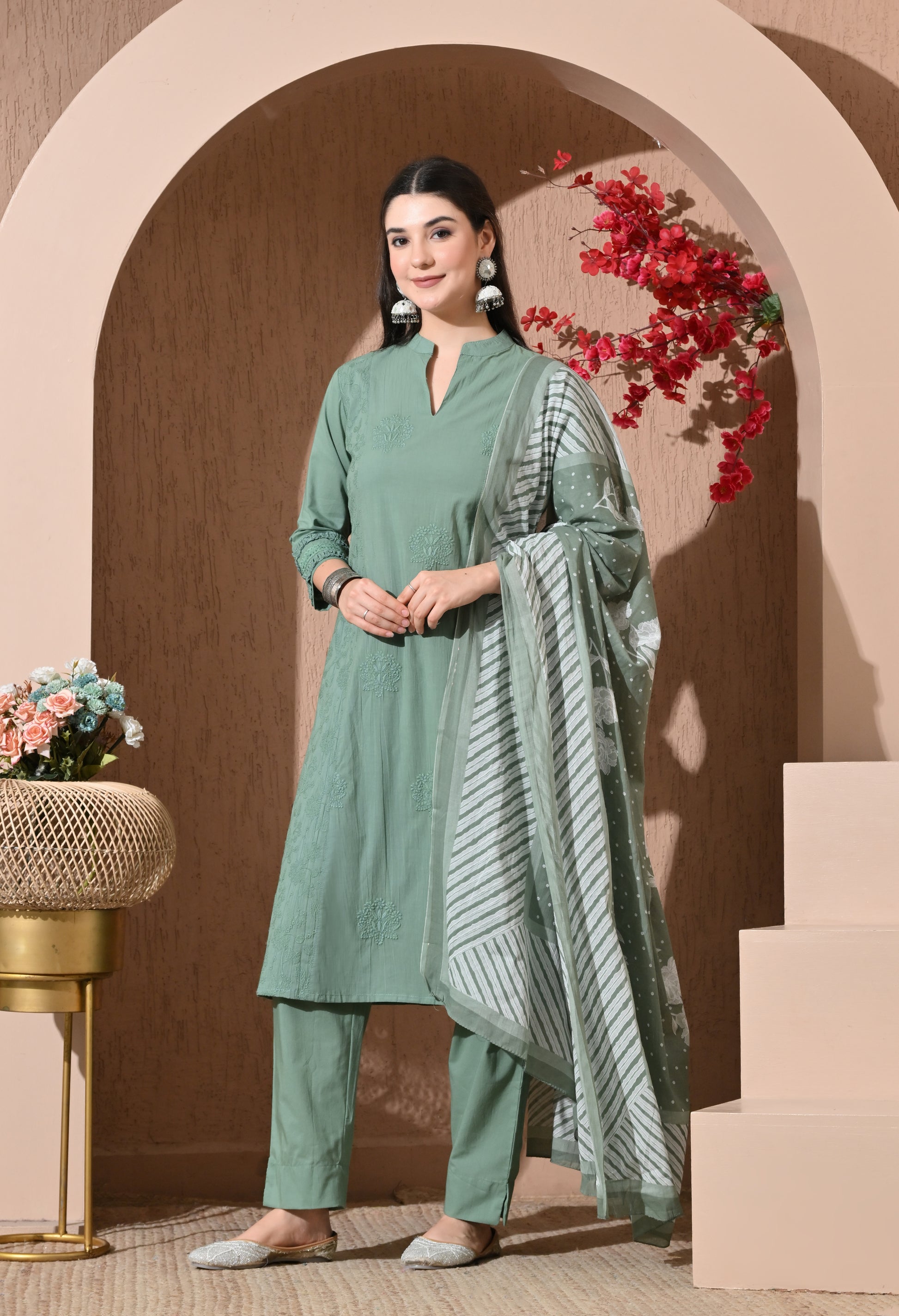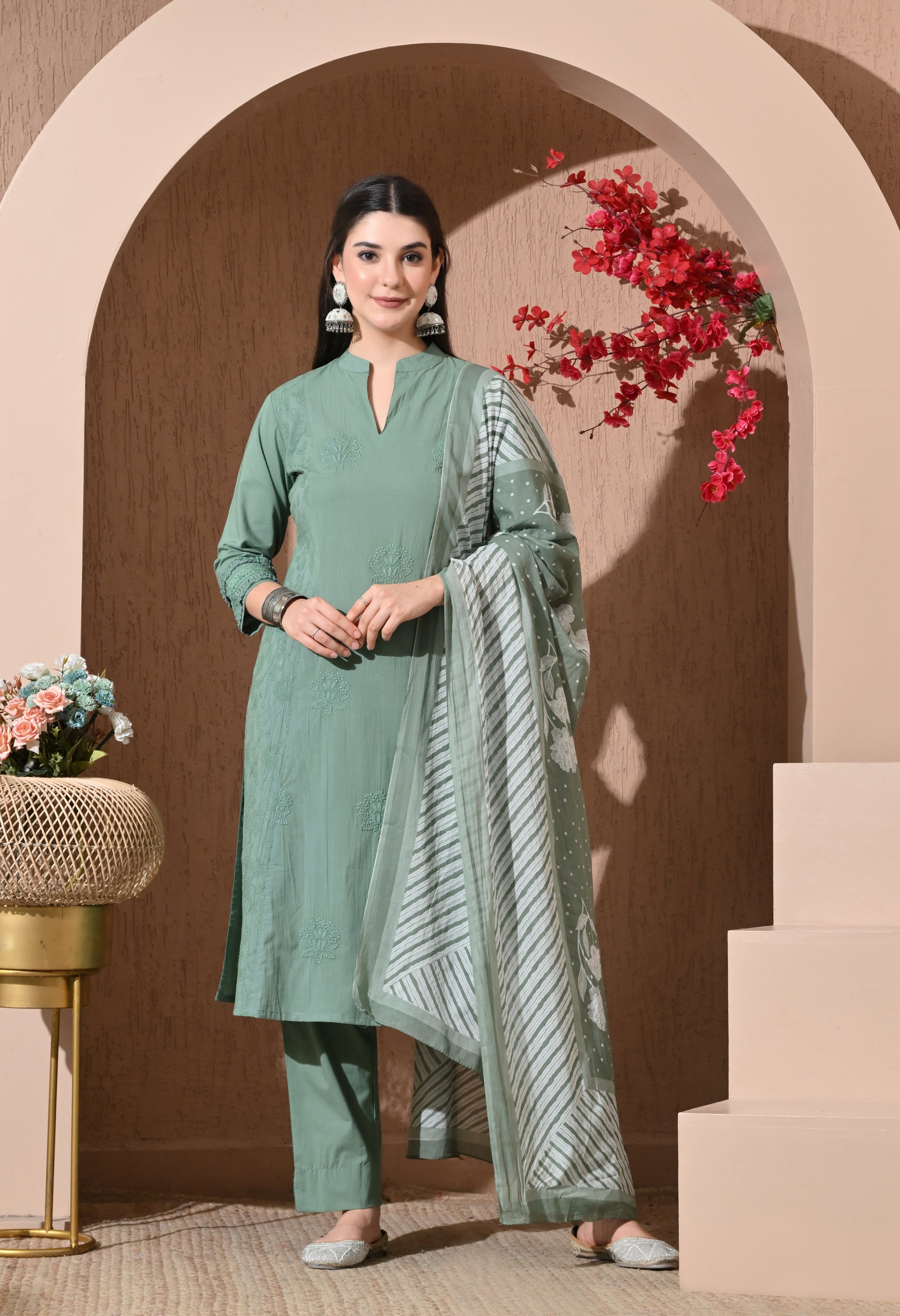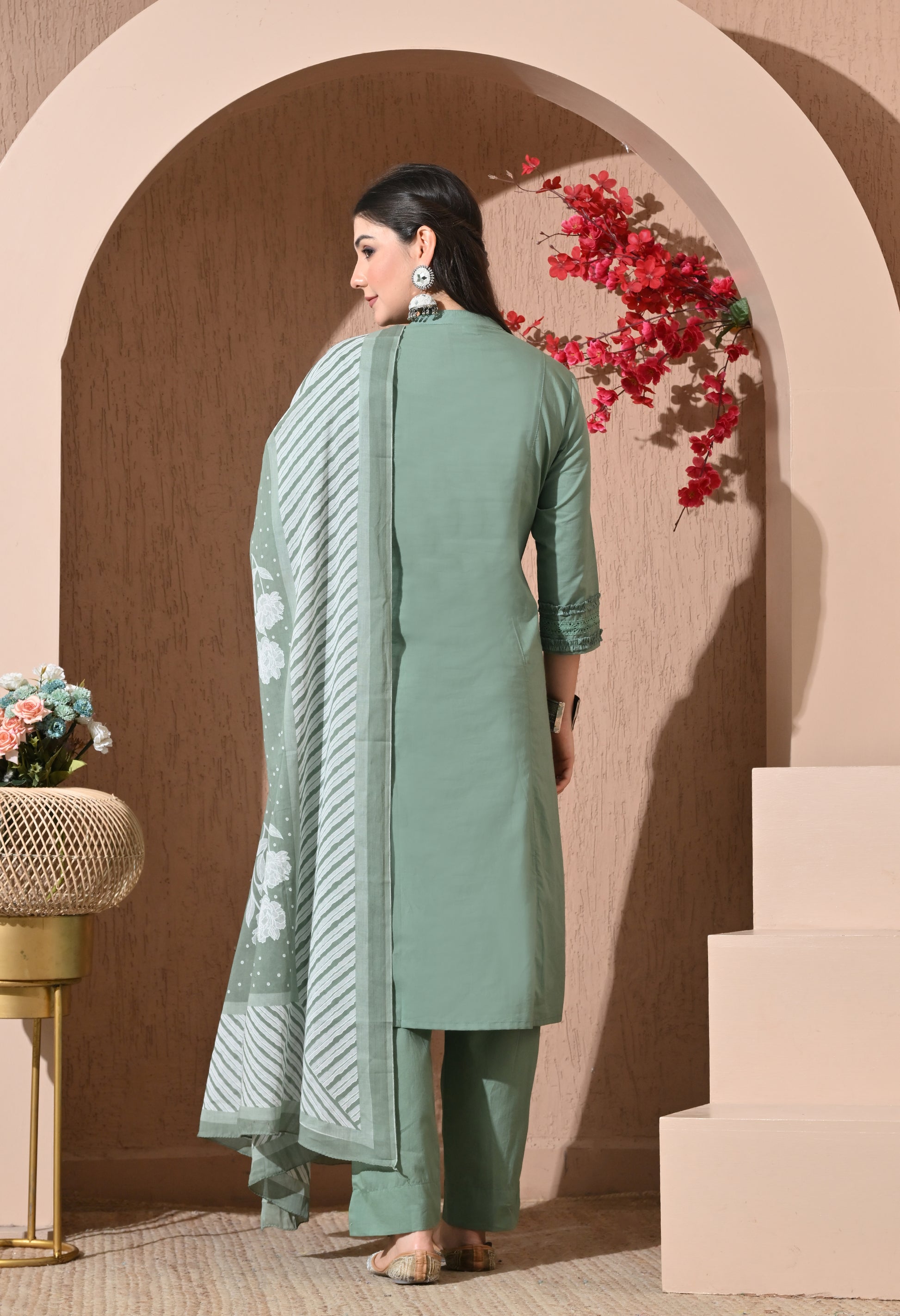 Embrace serene elegance with our Soft Premium Cotton suit set. This sophisticated ensemble features a graceful solid mint-green kurta with delicate embroidery or self-design, paired with matching straight pants and a coordinating printed dupatta, perfect for comfortable and refined wear.