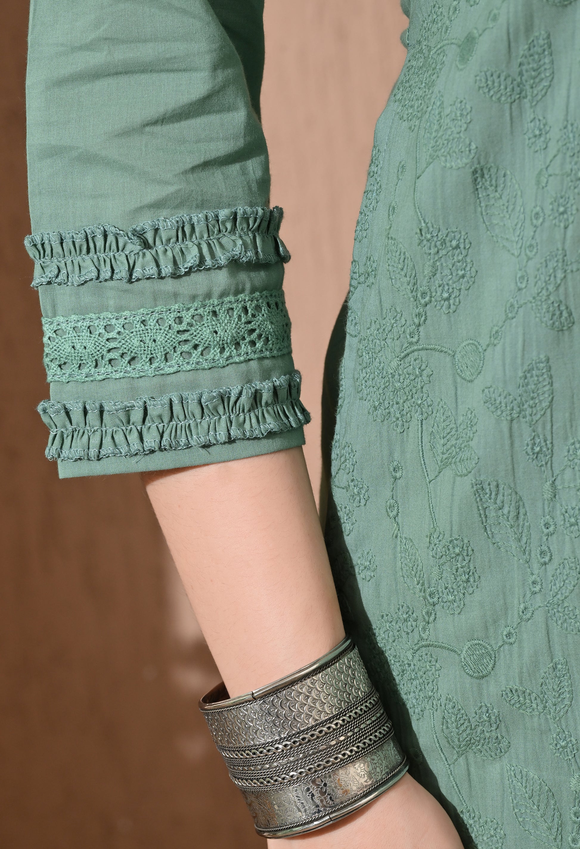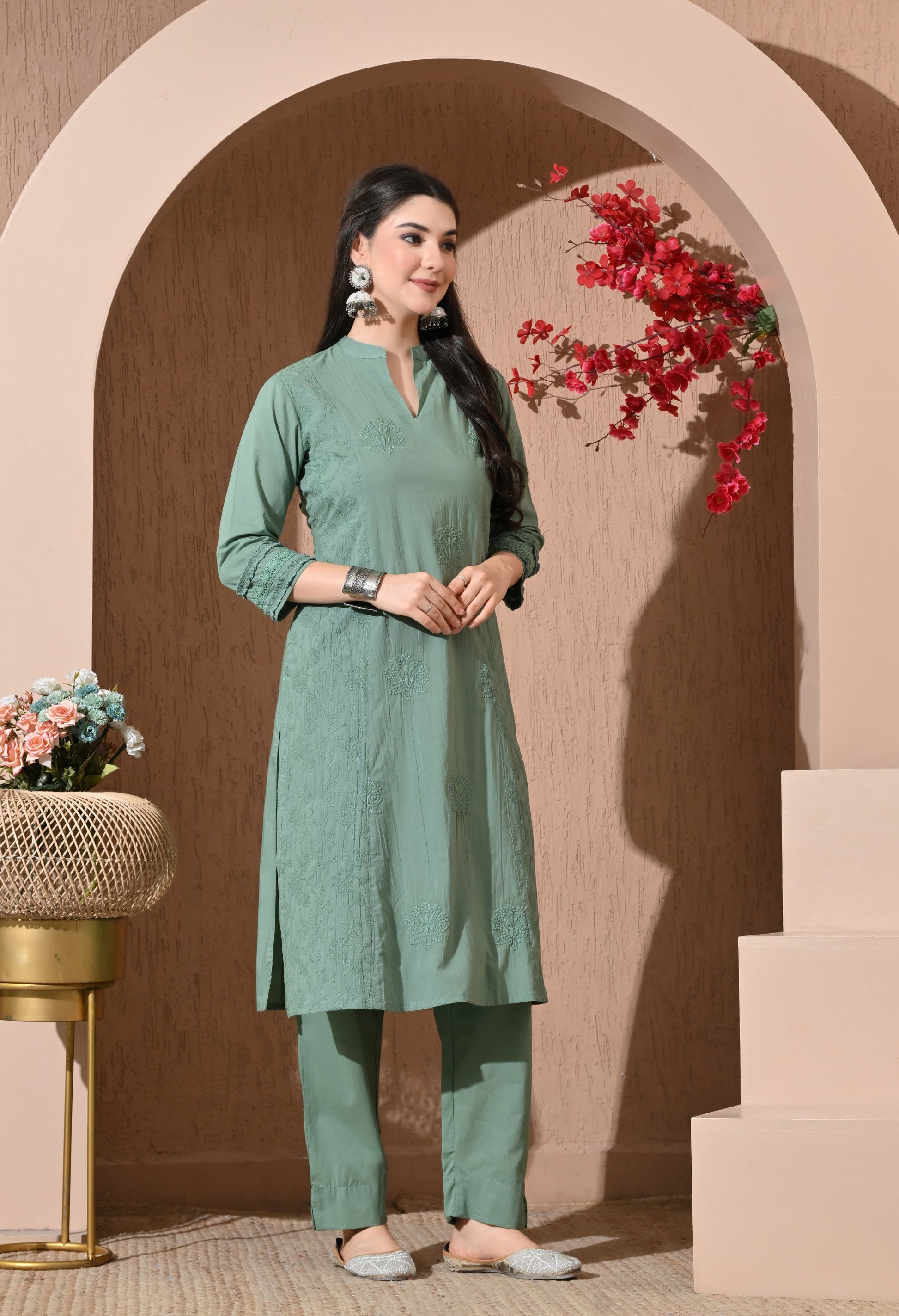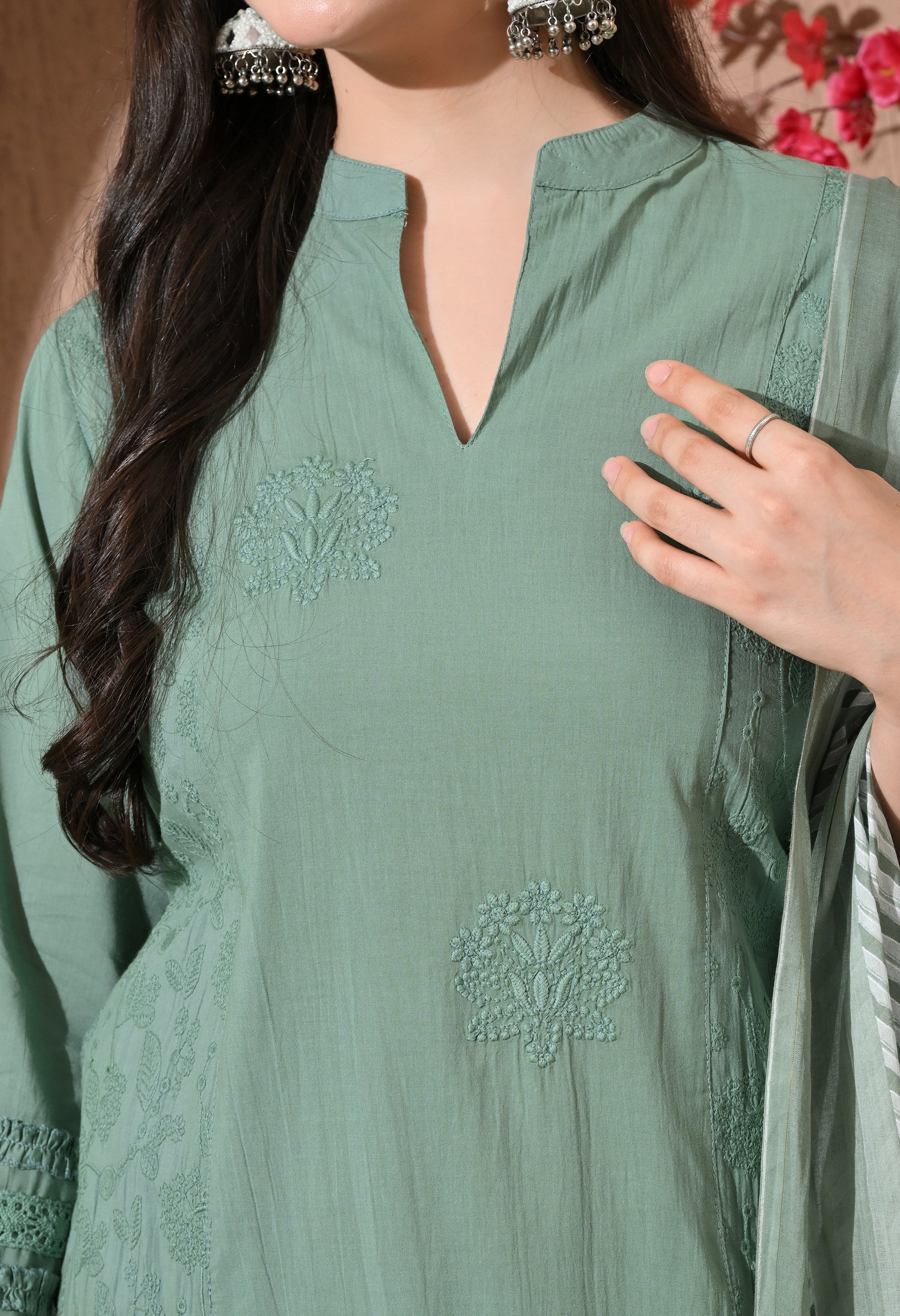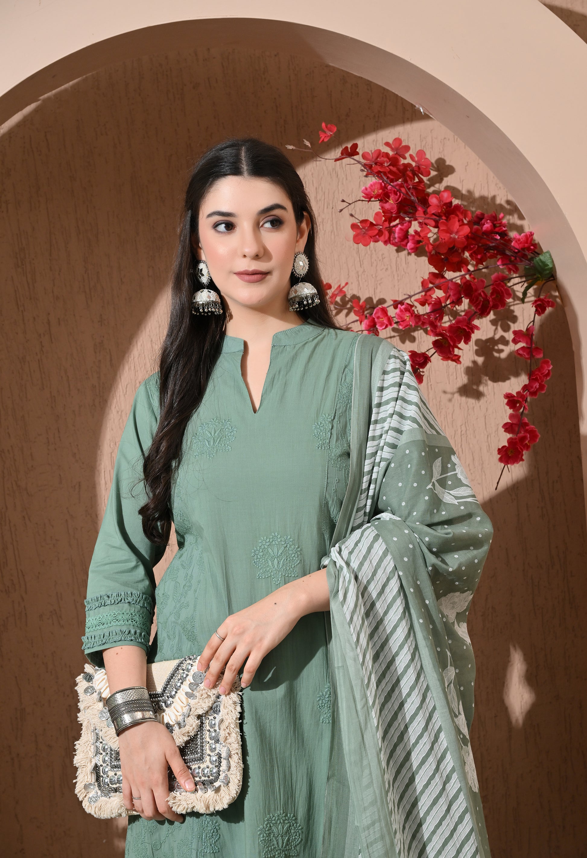Embrace serene elegance with our Soft Premium Cotton suit set. This sophisticated ensemble features a graceful solid mint-green kurta with delicate embroidery or self-design, paired with matching straight pants and a coordinating printed dupatta, perfect for comfortable and refined wear.