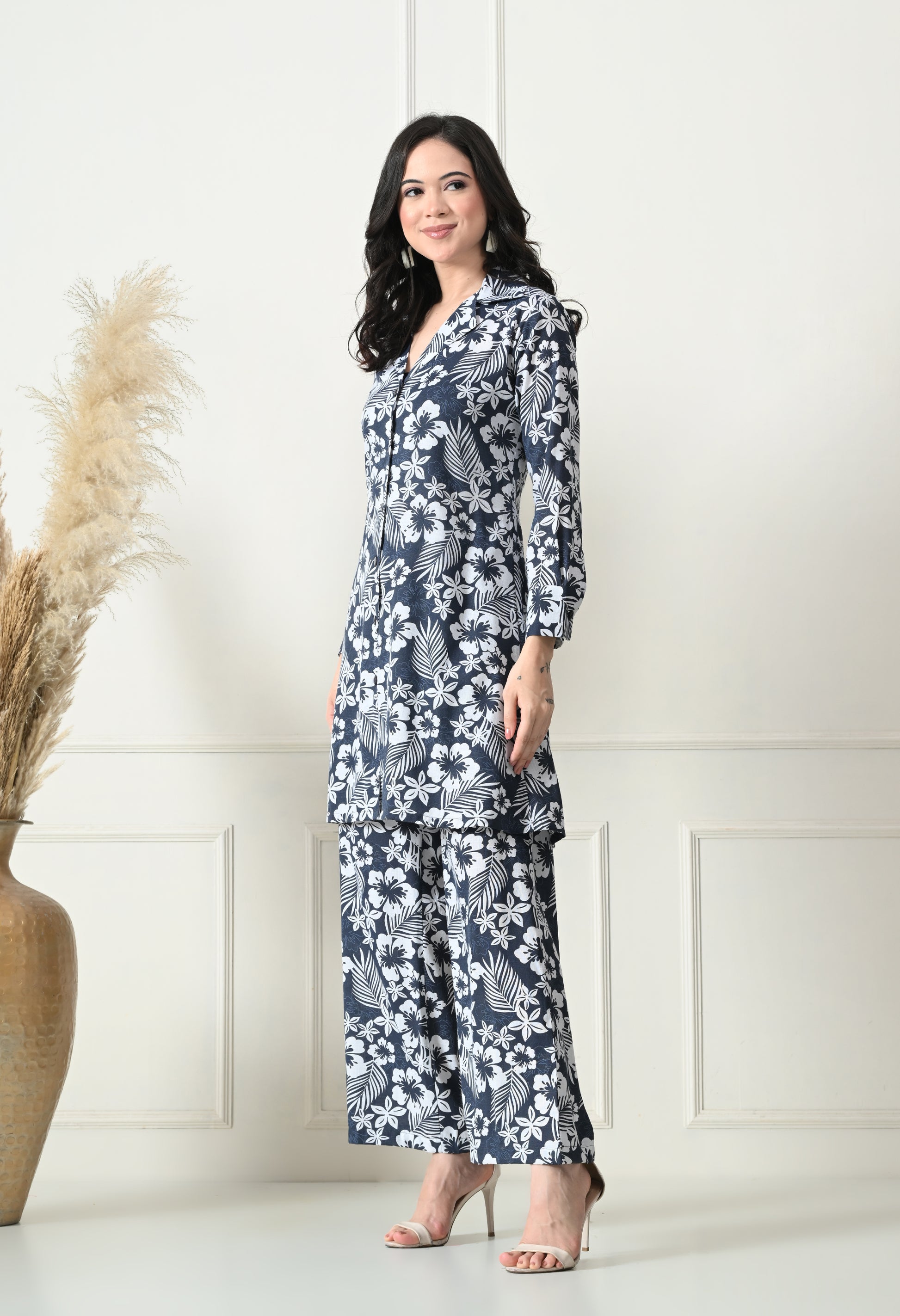 Step into effortless elegance with the *Midnight Bloom Rayon Co-ord Set*. Featuring a rich navy base adorned with delicate white floral prints, this co-ord set blends tropical charm with everyday ease. The longline top and relaxed-fit pants are crafted from breathable rayon fabric, offering both style and comfort. Ideal for brunch dates, vacations, or casual chic looks — just add heels and a clutch to complete the vibe.