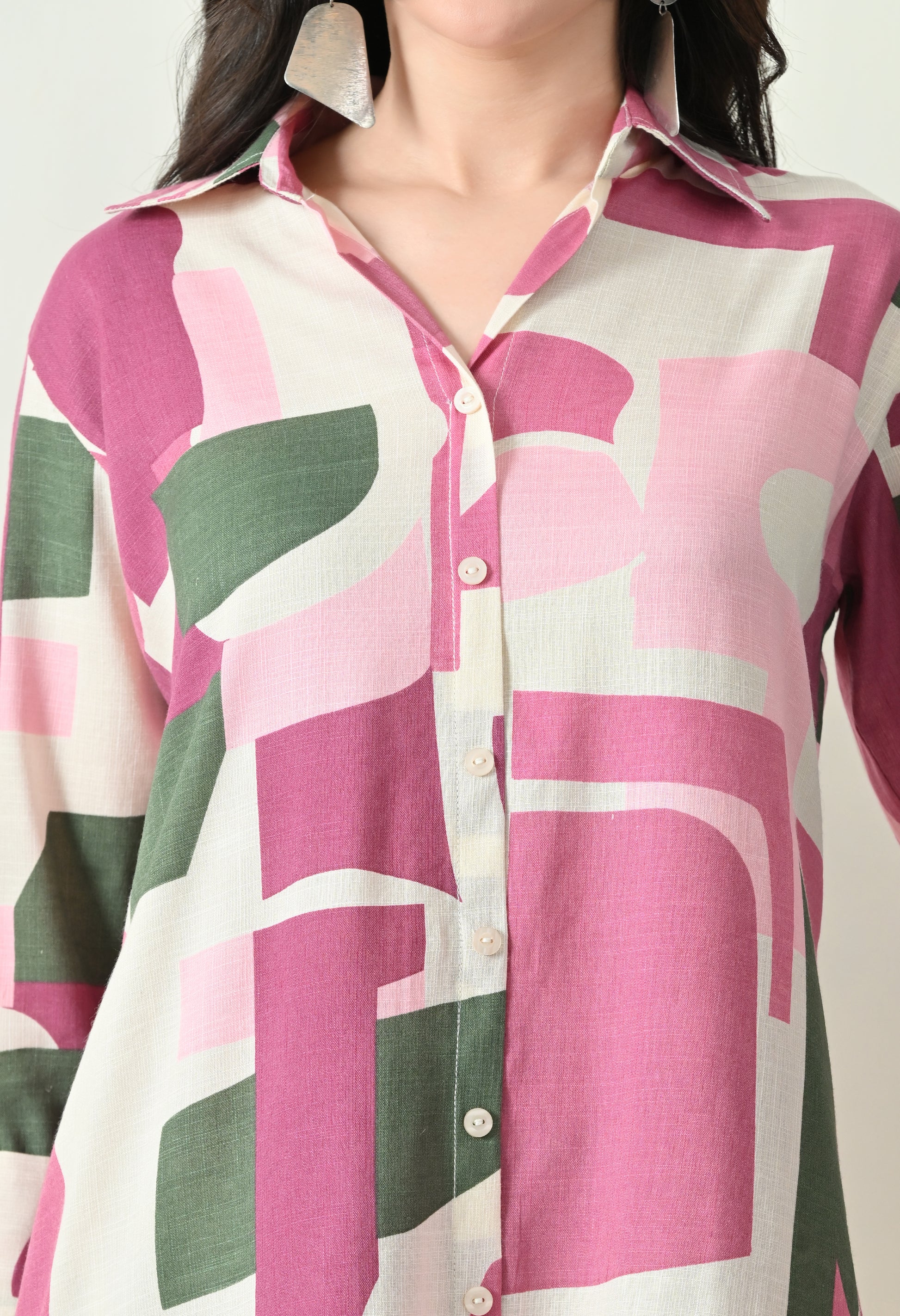 Add a playful twist to your wardrobe with the *Rosewood Pop Rayon Co-ord Set*. Designed in soft, breathable rayon, this set features a button-down top and matching trousers adorned with bold abstract prints in shades of rose pink, forest green, and off-white. The relaxed silhouette offers all-day comfort, while the eye-catching color palette makes it perfect for both casual outings and creative workdays. Style it with minimal accessories and heels for a standout yet effortless look.