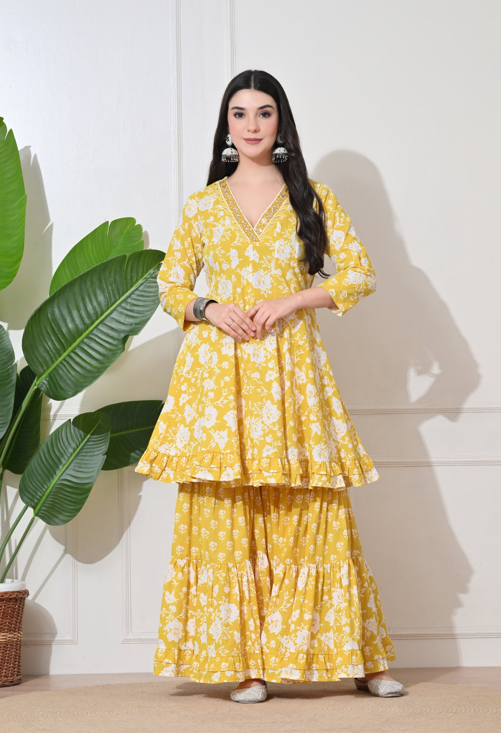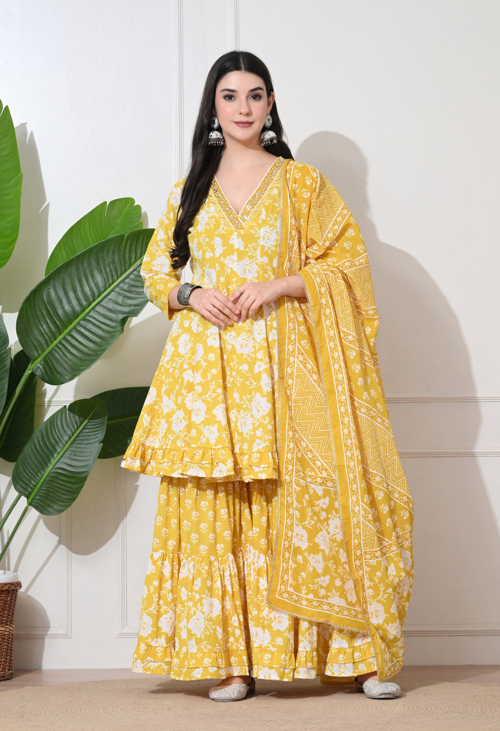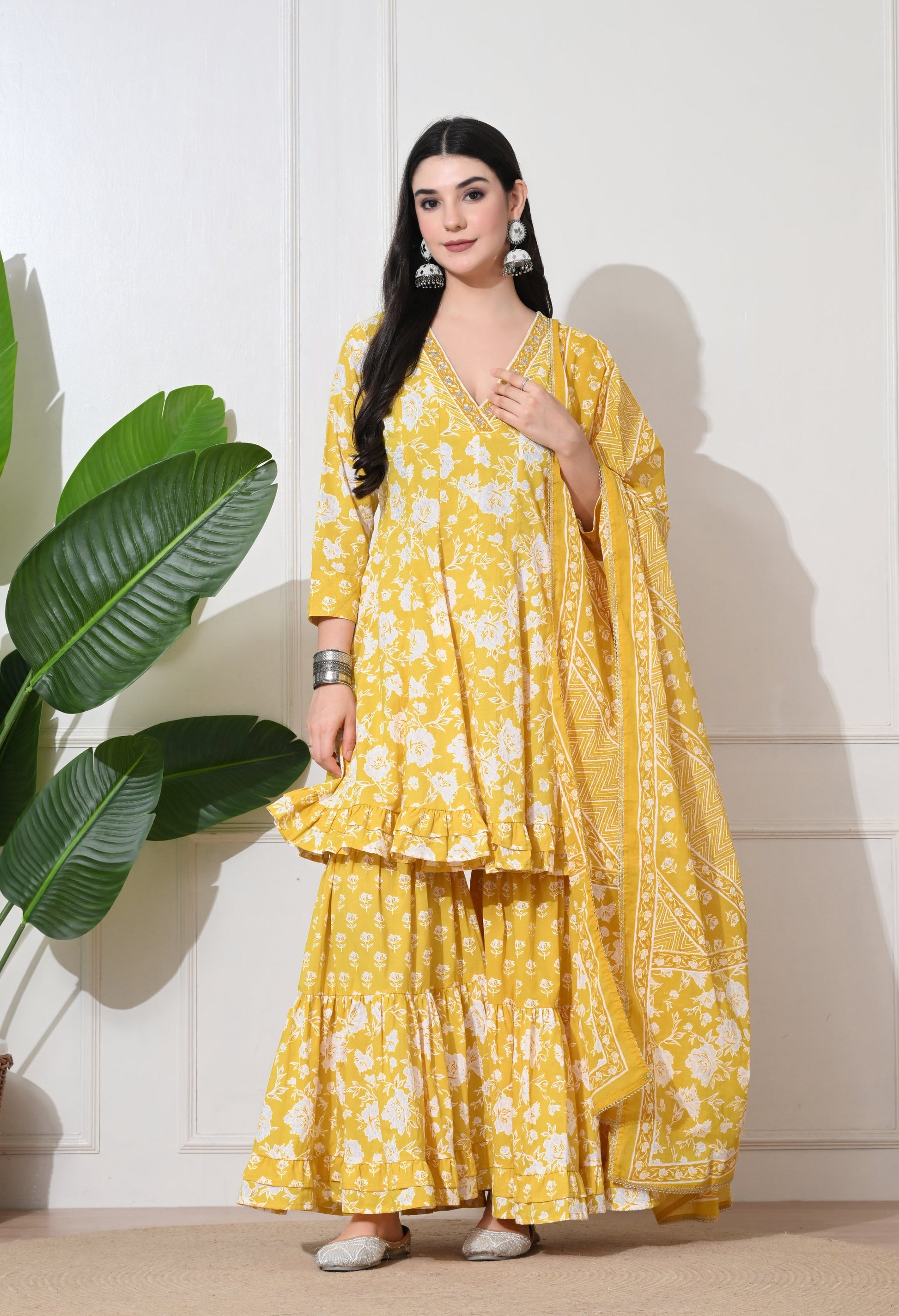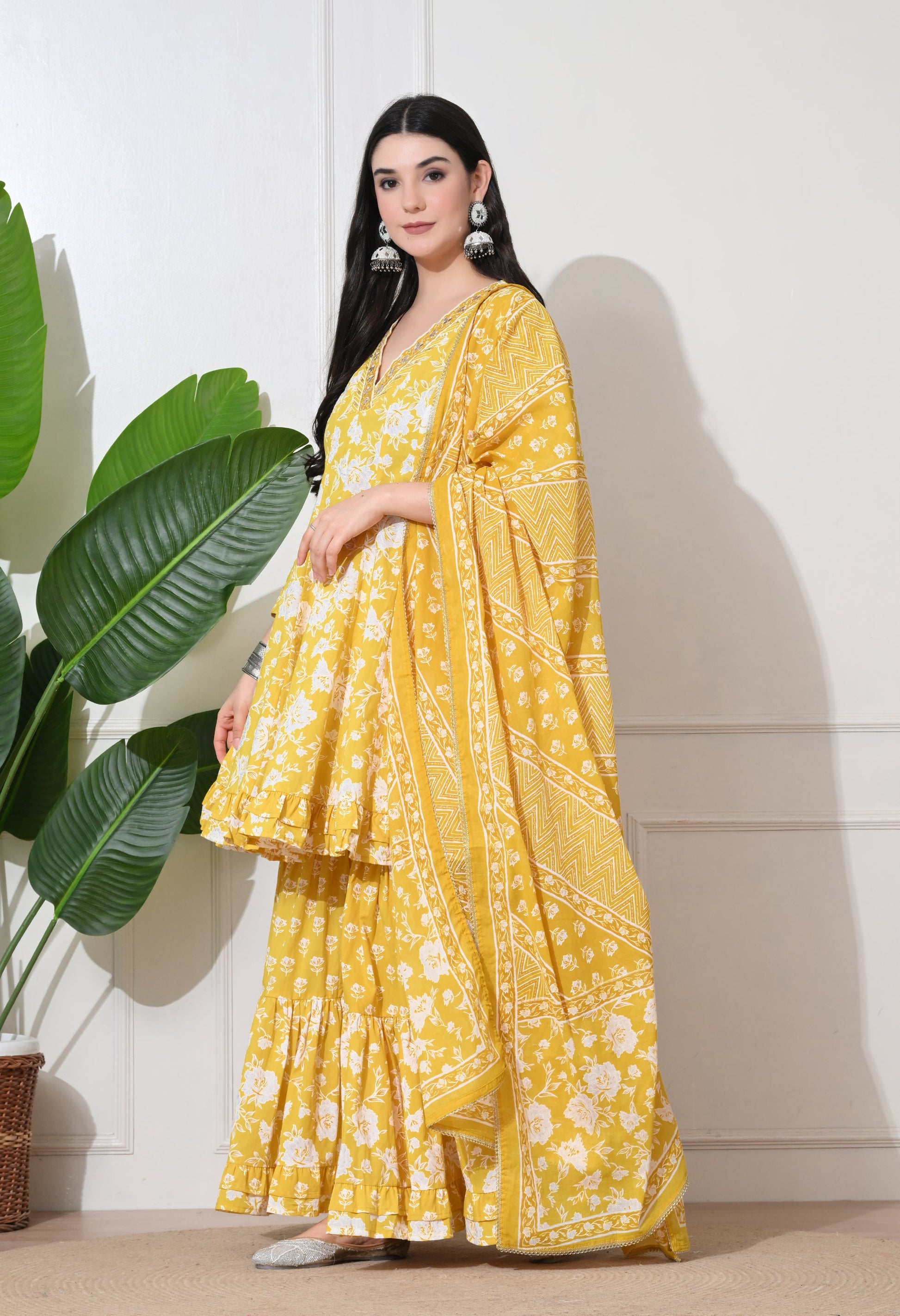 Brighten your day with our Soft Premium Cotton sharara set. This cheerful ensemble features a flared short kurta with delicate white floral prints, paired with a tiered sharara bottom and a matching printed dupatta, perfect for a vibrant and comfortable festive or casual look.