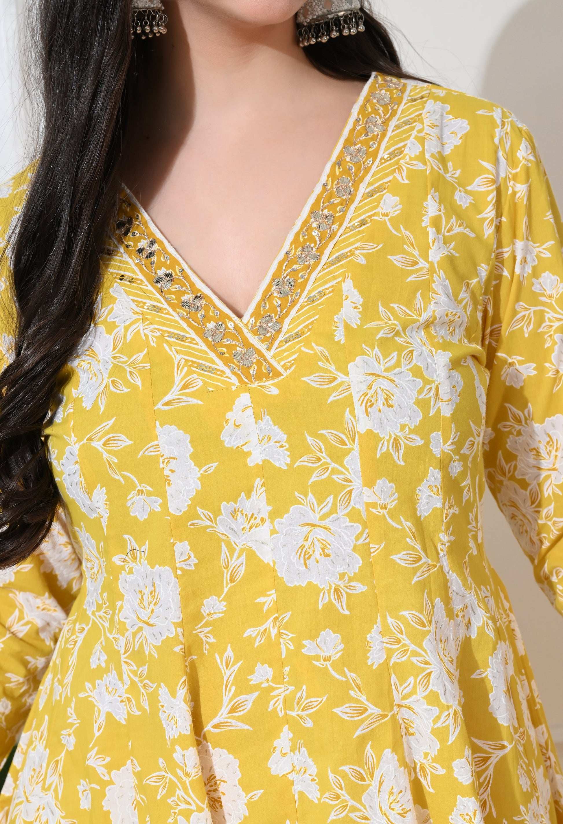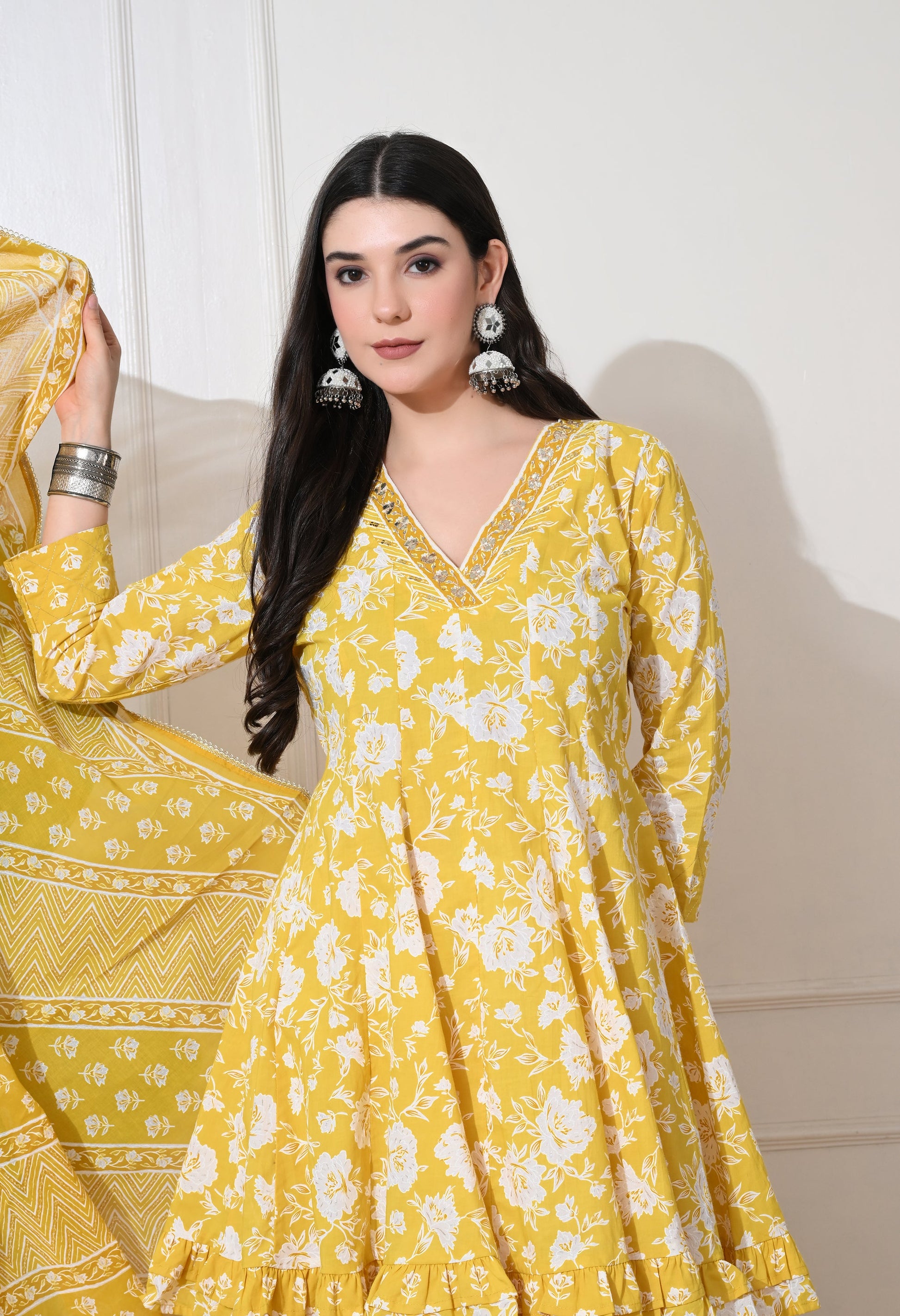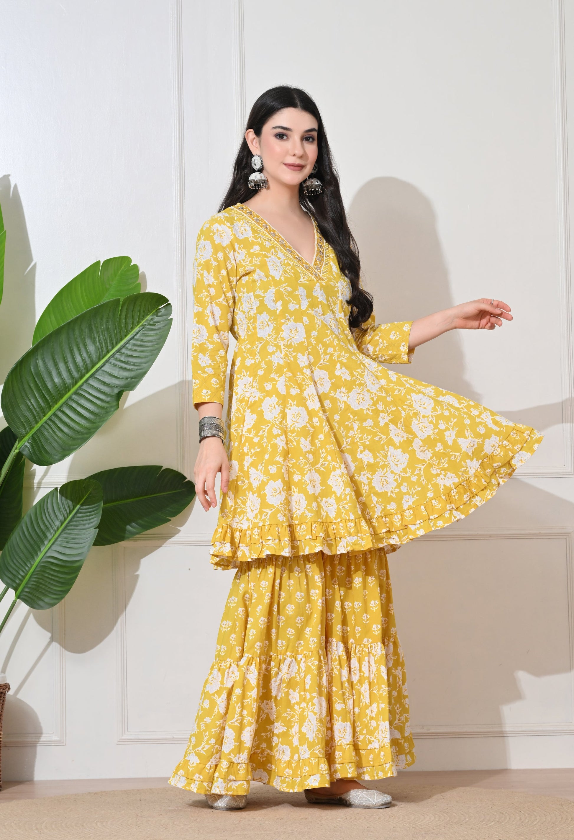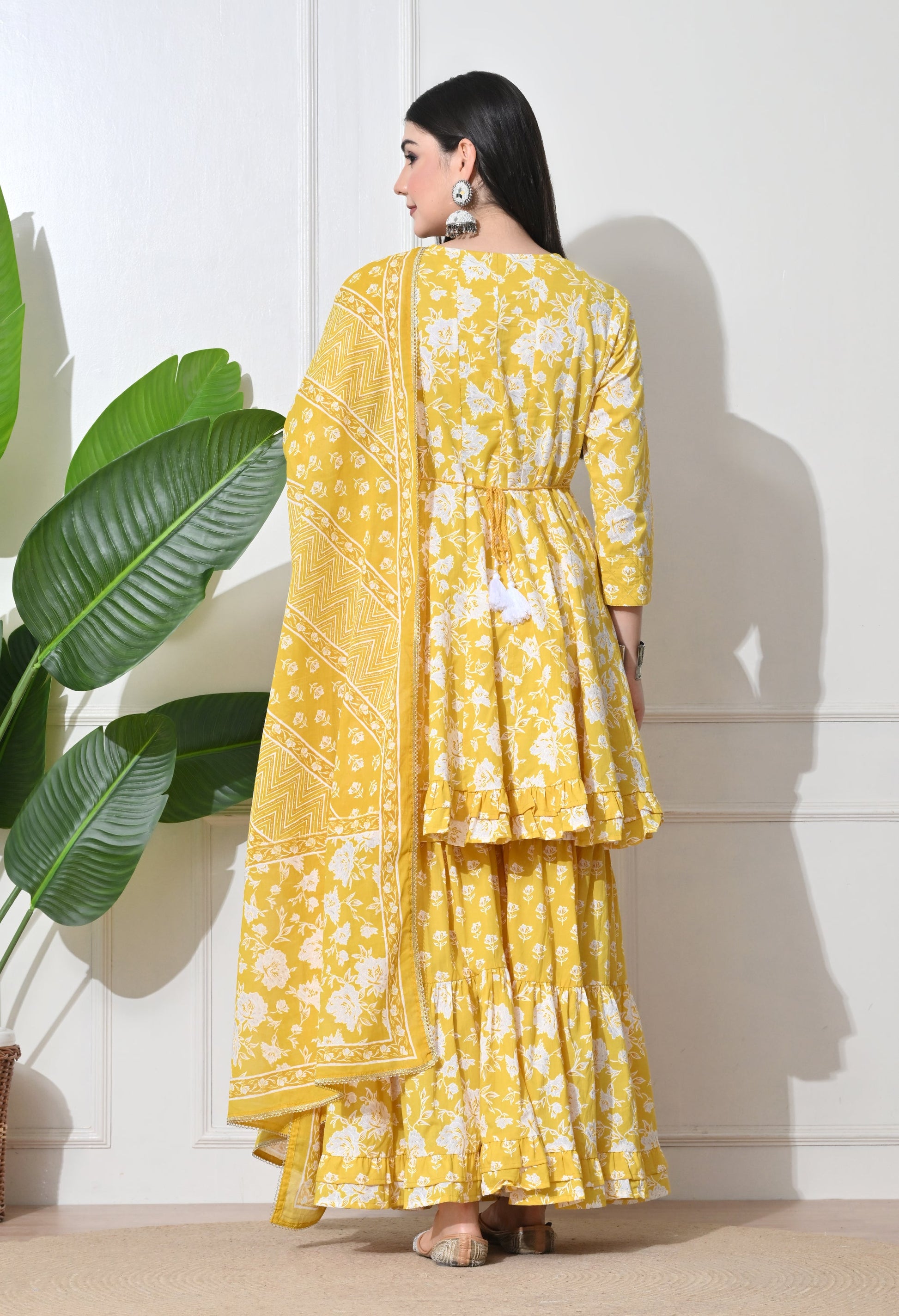 Brighten your day with our Soft Premium Cotton sharara set. This cheerful ensemble features a flared short kurta with delicate white floral prints, paired with a tiered sharara bottom and a matching printed dupatta, perfect for a vibrant and comfortable festive or casual look.