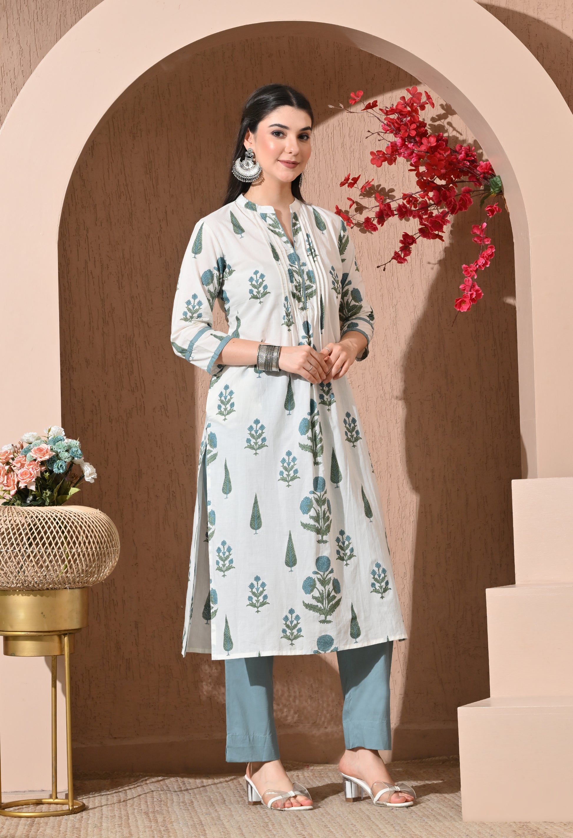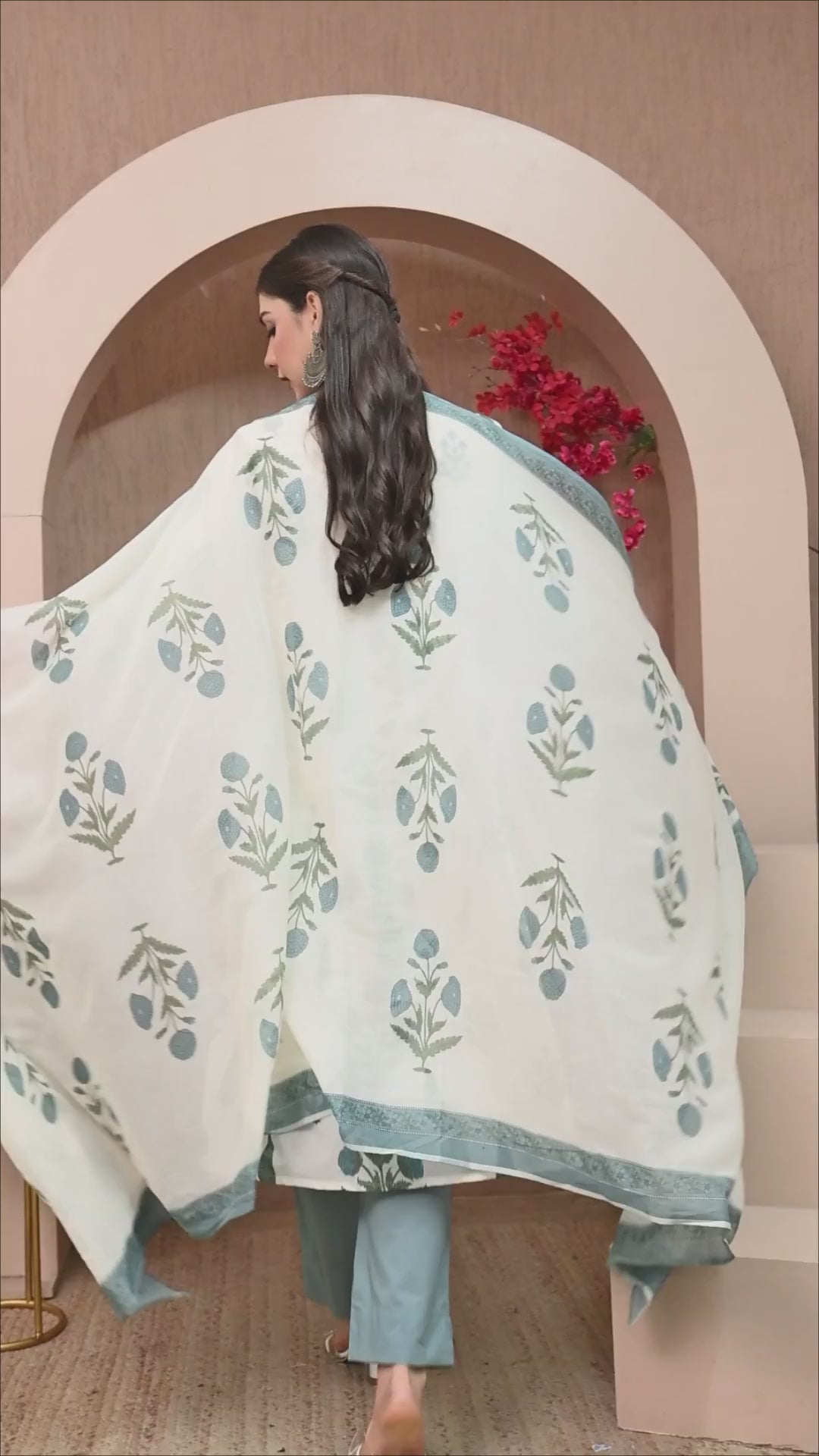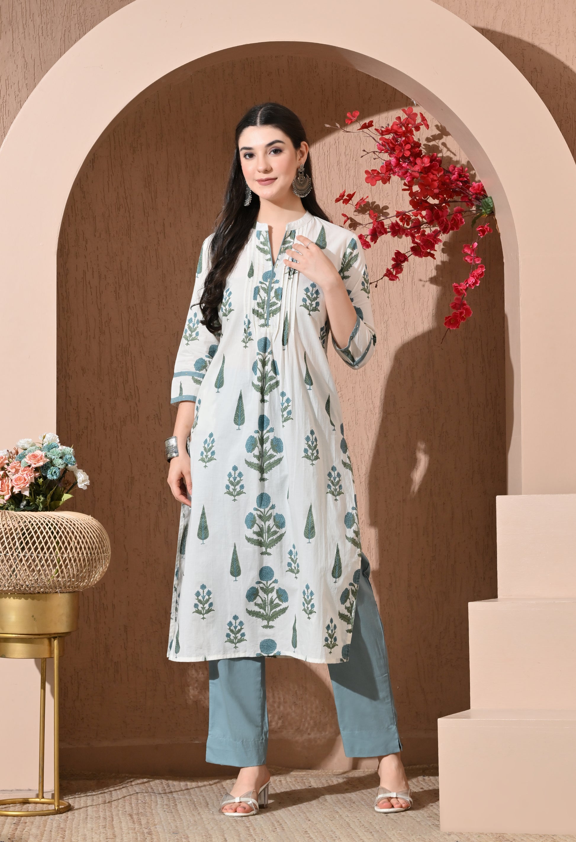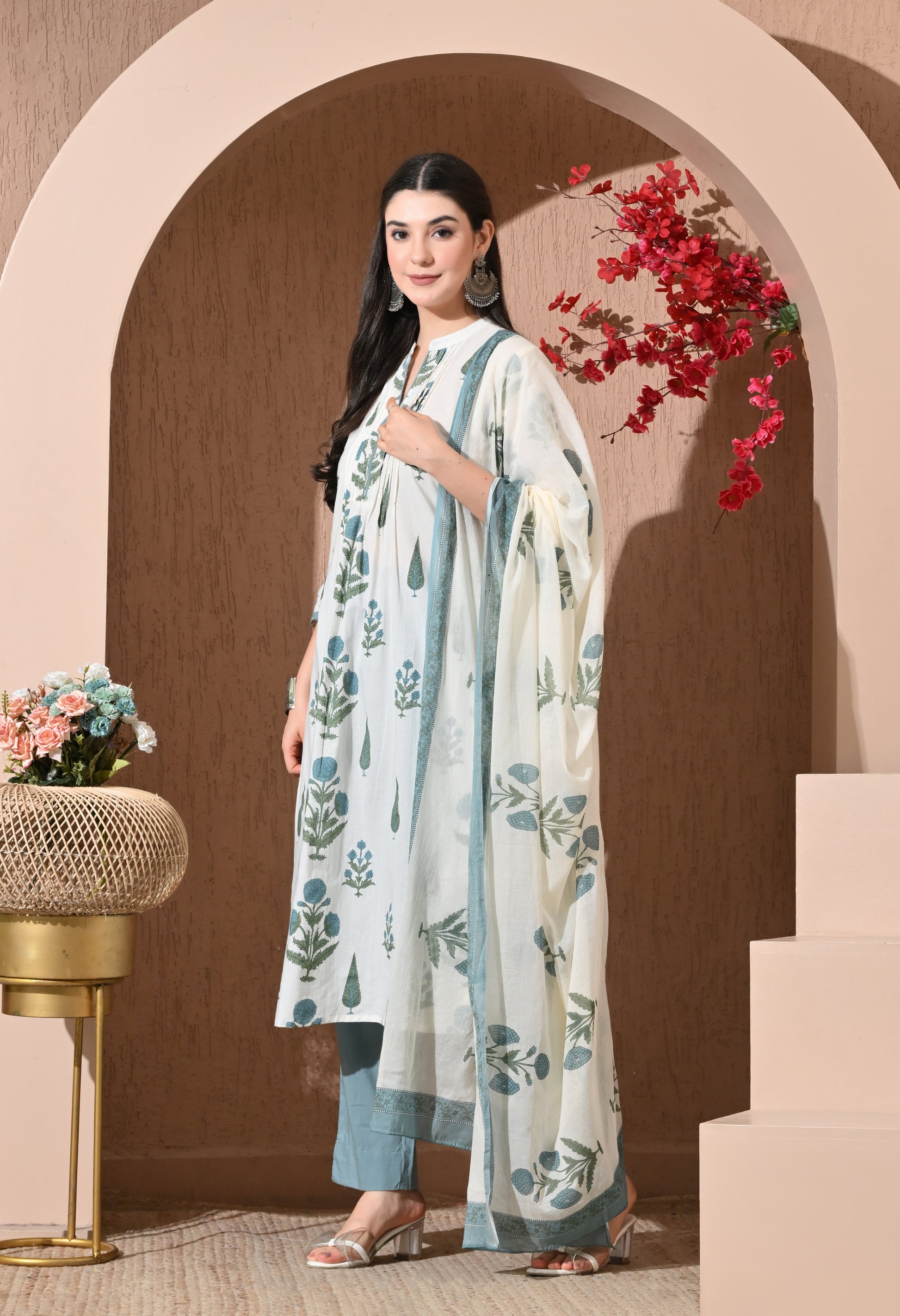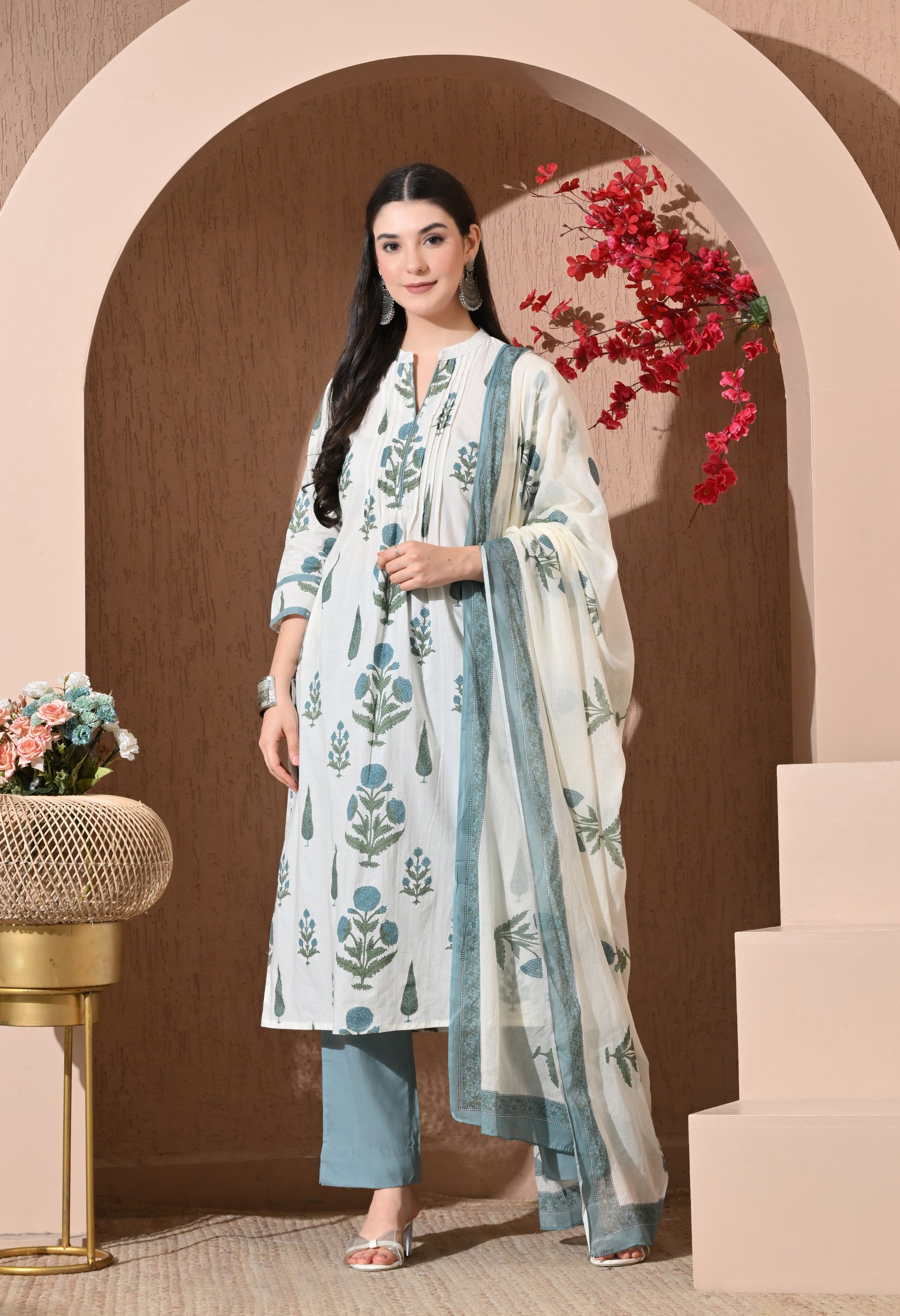 Embrace serene elegance with our Soft Premium Cotton suit set. This beautiful ensemble features a straight kurta adorned with lovely blue floral motifs and pleat detailing, paired with solid teal pants and a coordinating printed dupatta, perfect for sophisticated comfort and everyday grace.